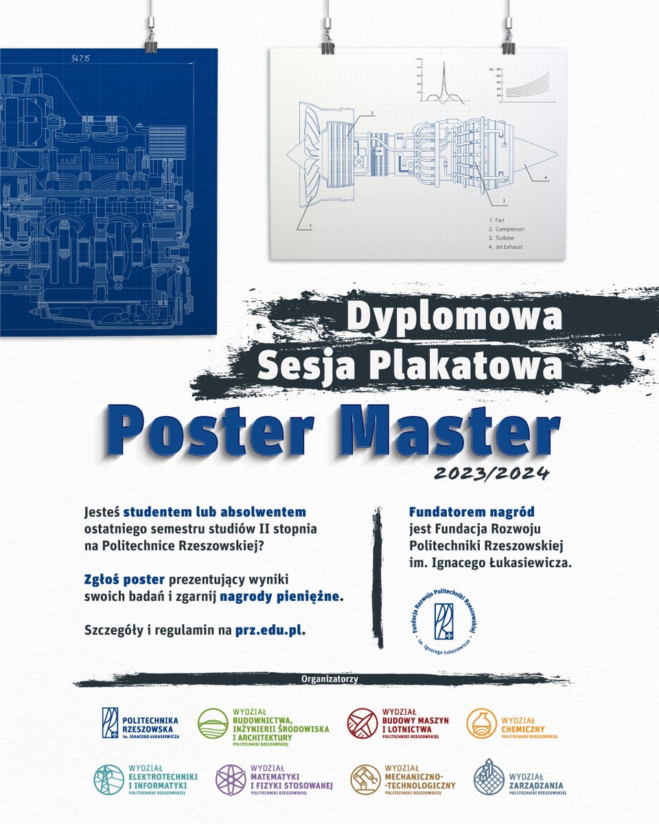 Dyplomowa Sesja Plakatowa POSTER MASTER to wydarzenie mające na celu promowanie osiągnięć studentów i absolwentów Politechniki Rzeszowskiej. Polega na prezentacji wyników badań uzyskanych przez studentów podczas realizacji prac dyplomowych magisterskich w danym roku akademickim. Prace są prezentowane w formie posterów, które poddane zostają ocenie przez Komisje Konkursowe powoływane na każdym z wydziałów Politechniki Rzeszowskiej. Wszyscy uczestnicy otrzymują certyfikat uczestnictwa w Dyplomowej Sesji Plakatowej POSTER MASTER a najlepsze prace są nagradzane.